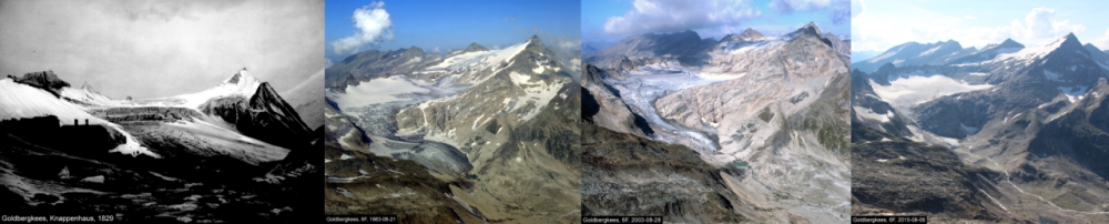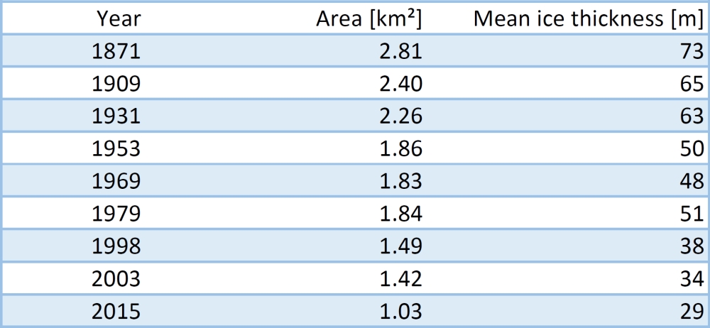 Between 1871 and 2015, the glacier lost 73 % of the glaciated area and 60 % of ice thickness. The following table shows the evolution of glacier area and mean ice thickness of Goldbergkees from 1871 – 2015 in different time steps.