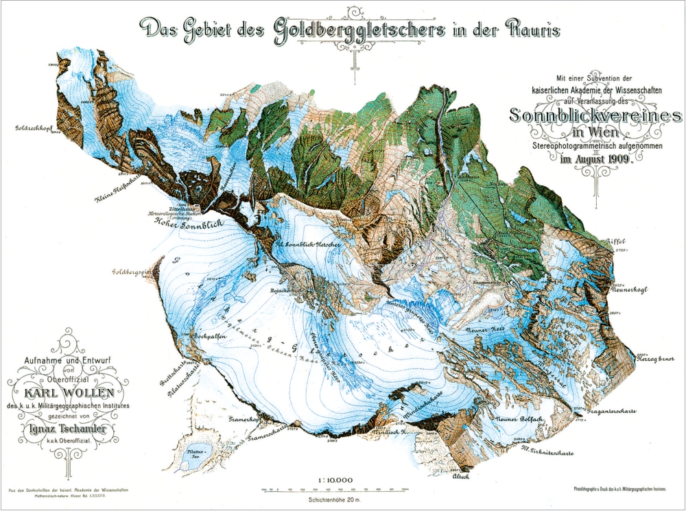 Historic map of Goldbergkees from 1909. This was the first time that terrestrial photogrammetry were used to map a glaciated region (source: A. Hübl, 1912).