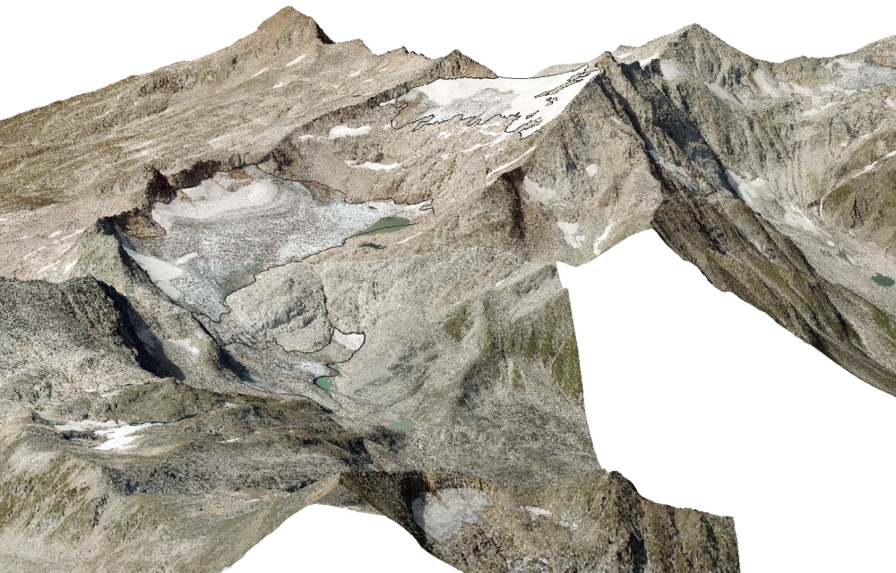 The three parts of Goldbergkees (aerial image from 2015, digital elevation model from 2009).