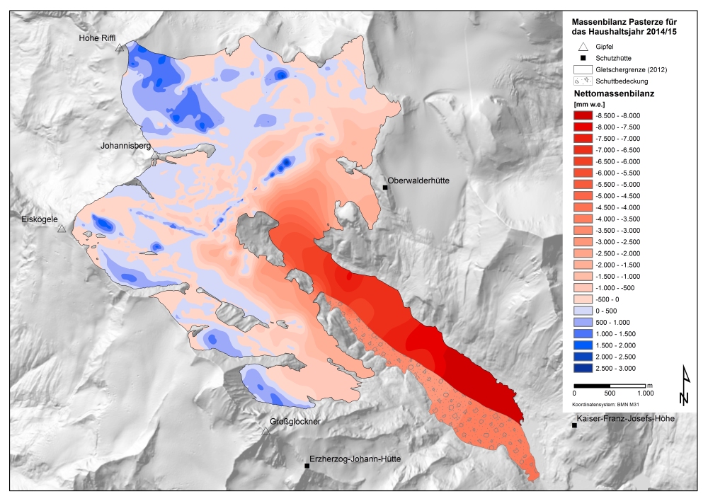 After a pleasant winter with 5 % more snow accumulation than average, the second warmest summer in history of temperature measurements and the driest summer since 1911 in Austria, melting rates were near record level from 2003. At the glacier terminus of Pasterze, the thickness of ice decreases up to 10 m, between autumn 2014 and autumn 2015. Overall, the annual mass balance for Pasterze is -1.4 m w.e. a-1. For the glaciers at Hoher Sonnblick, the annual mass balance for Kleinfleißkees is -1.4 m w.e. a-1 and for Goldbergkees -1.9 m w.e. a-1.