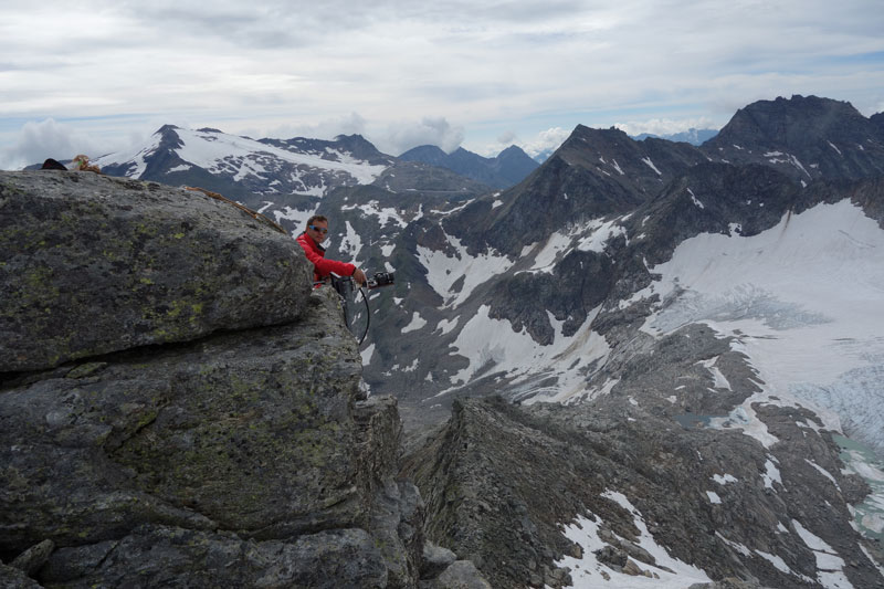 The camera is located on the ridge between the alpine hut Rojacherhütte and the summit of Hohen Sonnblick at 2932 m a.s.l.. The direction of view is southeast with skiing area Mölltaler Gletscher far left on the image, the Goldbergkees in the centre and the mountain pass Iselsberg rightmost. The camera was installed 2nd August 2016. The engaged camera is a Canon EOS1200D. For power supply, a solar panel is used and the power is stored in a accumulator. The glaciological station network Sonnblick contains beside webcam Goldbergkees also webcam Kleinfleißkees, webcam Sonnblick Observatorium, automatic weather station Kleinfleißkees, mass balance station Goldbergkees and gauging station Huettwinklache.