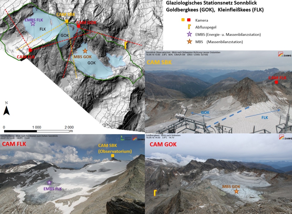Map of glaciological station network Sonnblick with glacier boundary of Goldbergkees (GOK) and Kleinfleißkees (FLK) (top) and images of the webcams Kleinfleißkees (CAM FLK), Goldbergkees (CAM GOK) and Sonnblick Observatorium (CAM SBK) (bottom). Also marked in the map is the automatic weather station (EMBS FLK) at Kleinfleißkees, mass balance station (MBS GOK) Goldbergkees and gauging station Huettwinklache beside the localisation of the webcams.