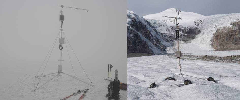 Mass balance station (MBS PAS) (left) located in the upper part of Pasterze and the automatic weather station (EMBS PAS) situated on the tongue of Pasterze.