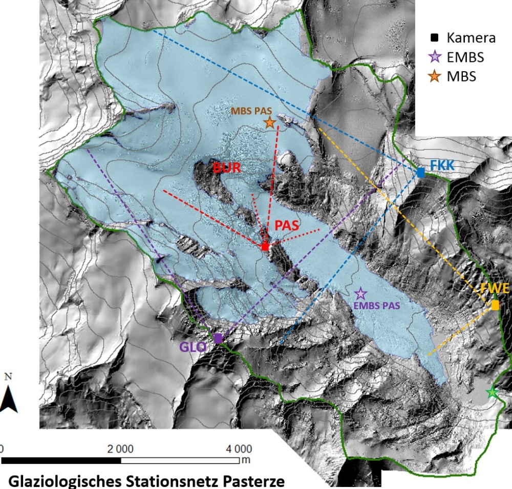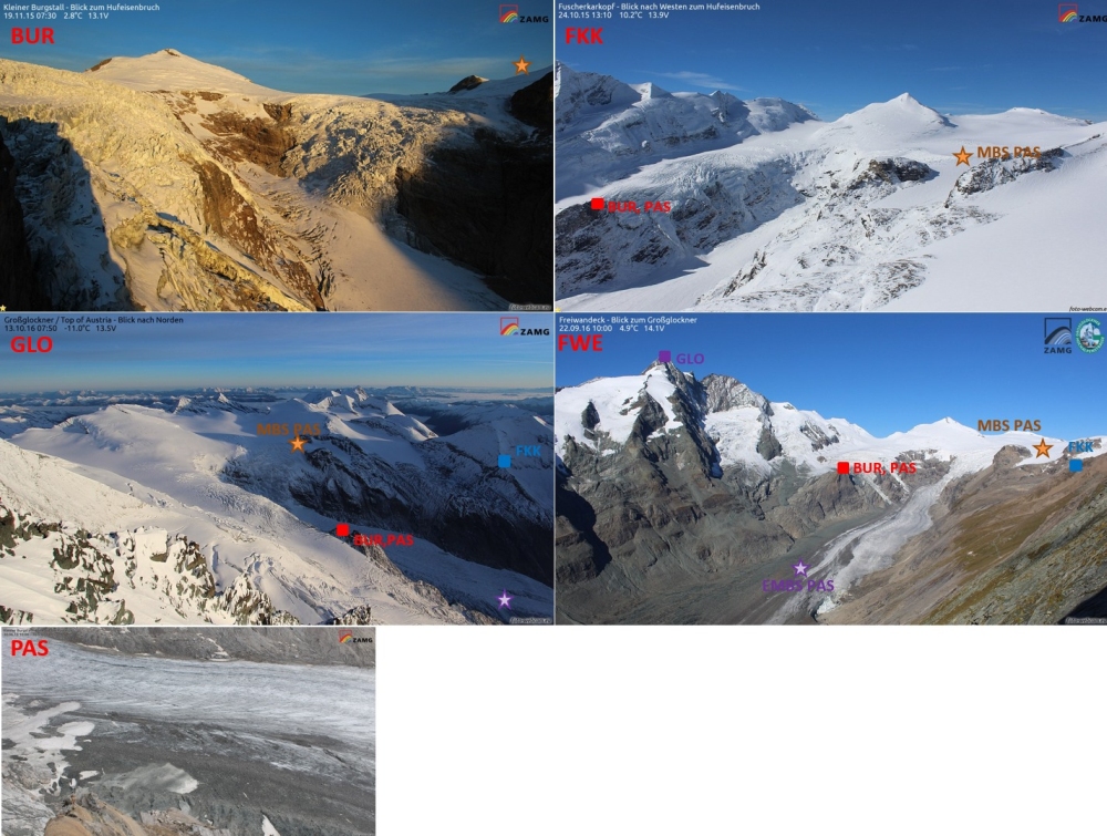 In cooperation with foto-webcam.eu, University of Graz, Großglockner Hochalpenstraße AG and TGM, a glaciological station network was established. In total 5 cameras, one automatic weather station (EMBS PAS) and one mass balance station (MBS PAS) are in operation. The locations of the cameras are Freiwandeck (FWE), Fuscherkarkopf (FKK), kleiner Burgstall with two cameras (BUR) and (PAS) and Großglockner (GLO). This is by the way the highest situated camera in Austria with an altitude of 3750 m a.s.l.. On the glacier surface there is a automatic weather station situated on the glacier tongue and a mass balance station in the upper part of the glacier.
